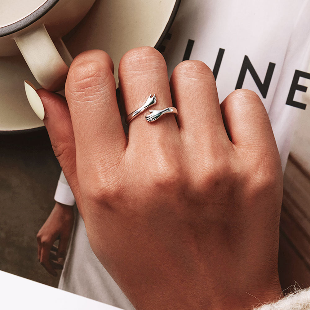 このリングで、永遠の抱擁の温もりを感じてください。このユニークな作品は、永遠の抱擁をイメージして、両手があなたの指を繊細に握りしめている様子を描いています。単なるリングではなく、毎日身につけられる安らぎと愛のシンボルです。